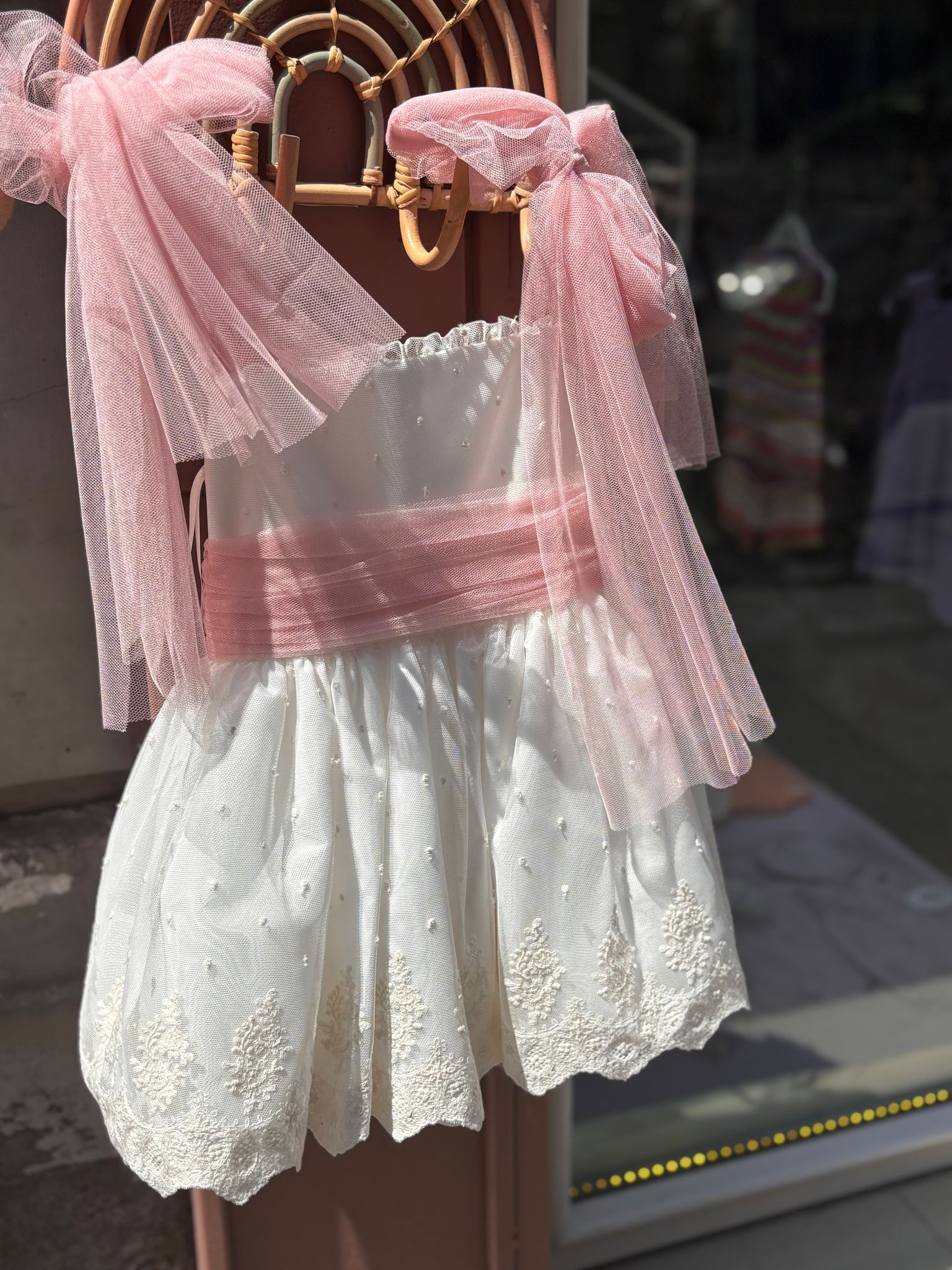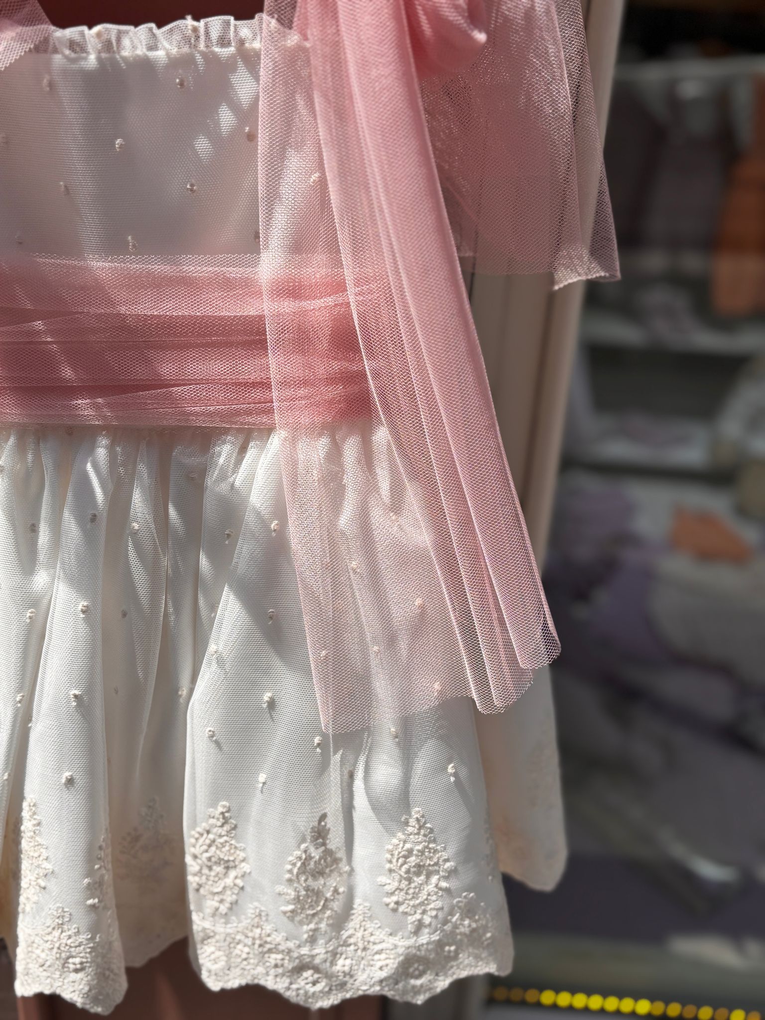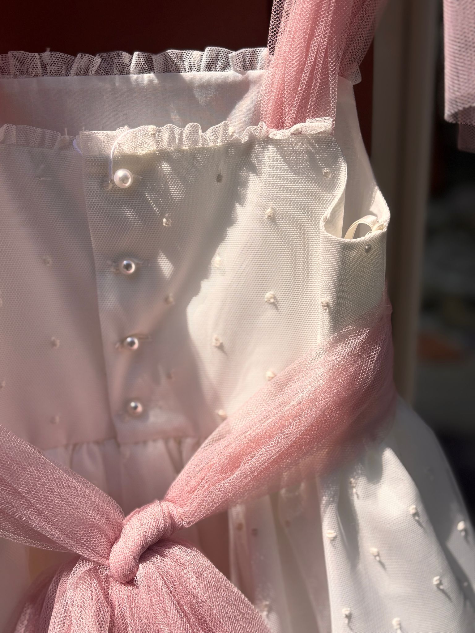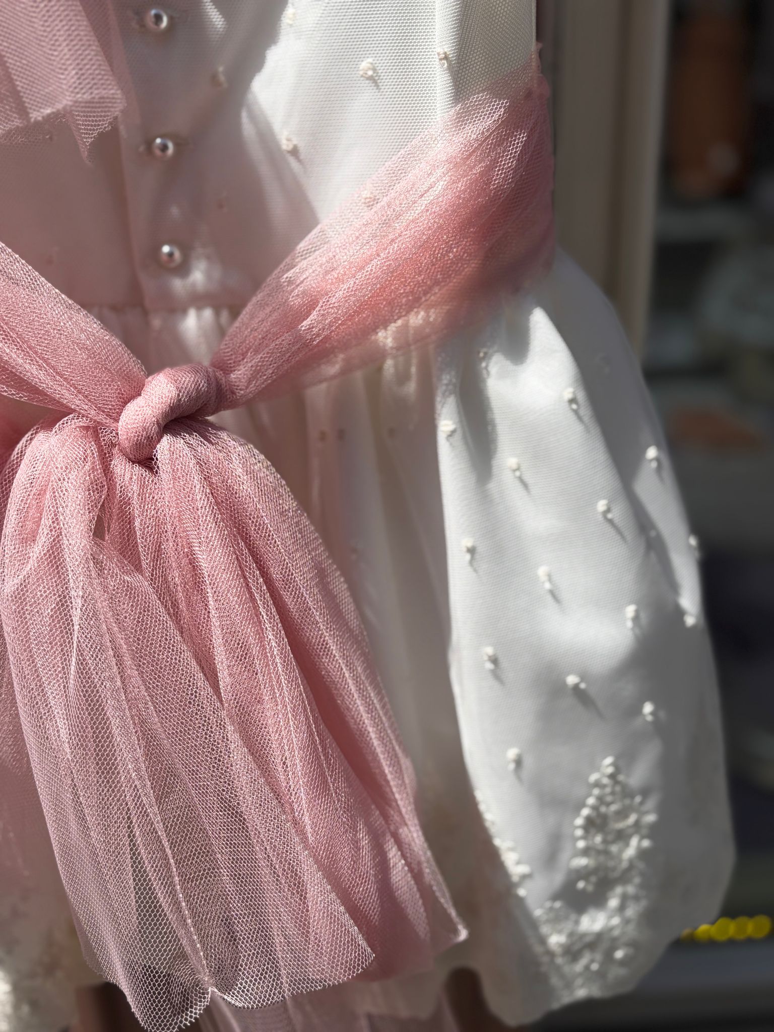 meraviglioso abito in pizzo e tulle completamente foderato in cotone, impreziosito con bottoncini di perle