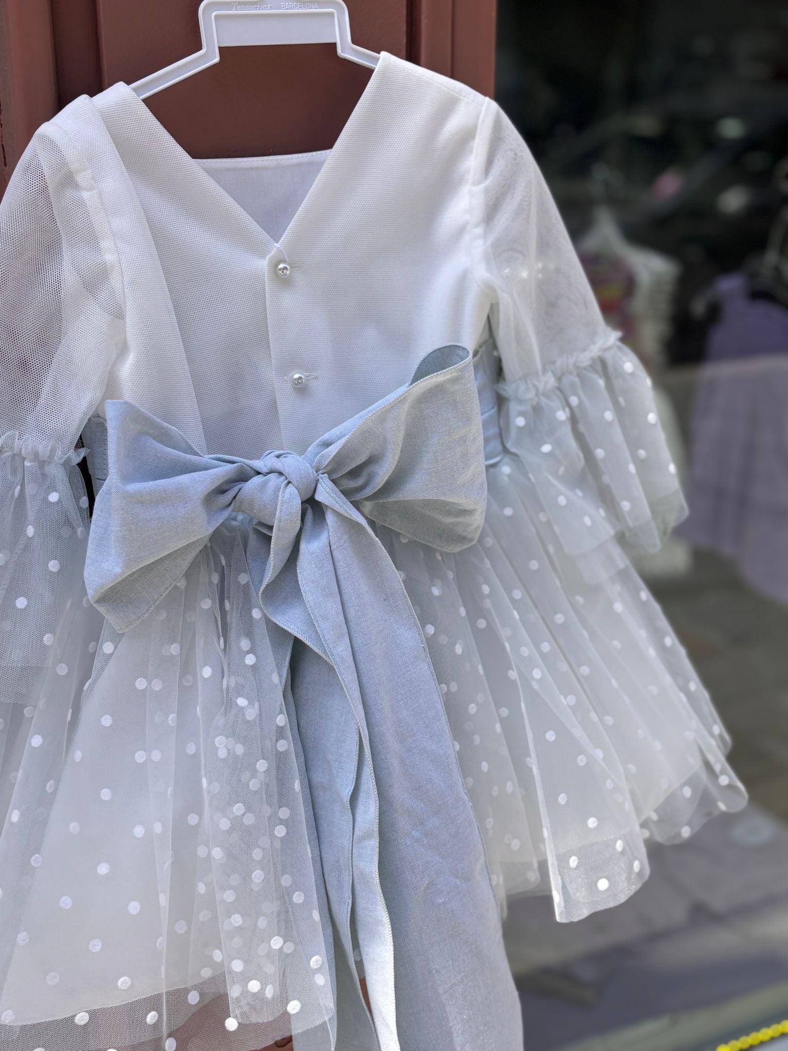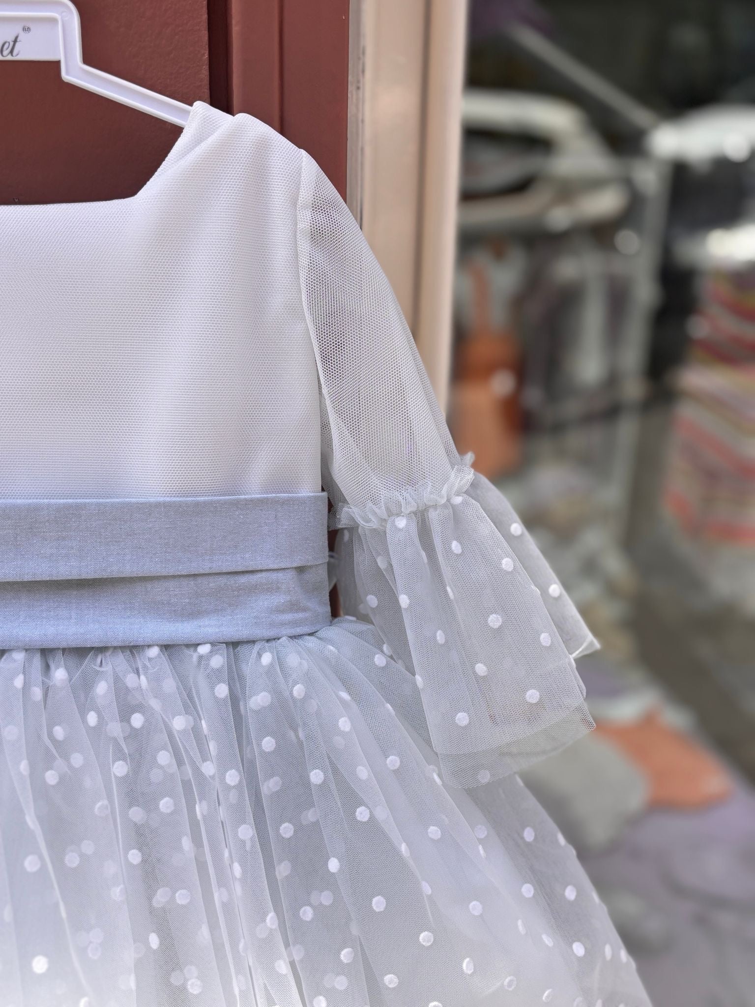 Abito in organza e tulle,chiusura sulla schiena con bottoncini di perle