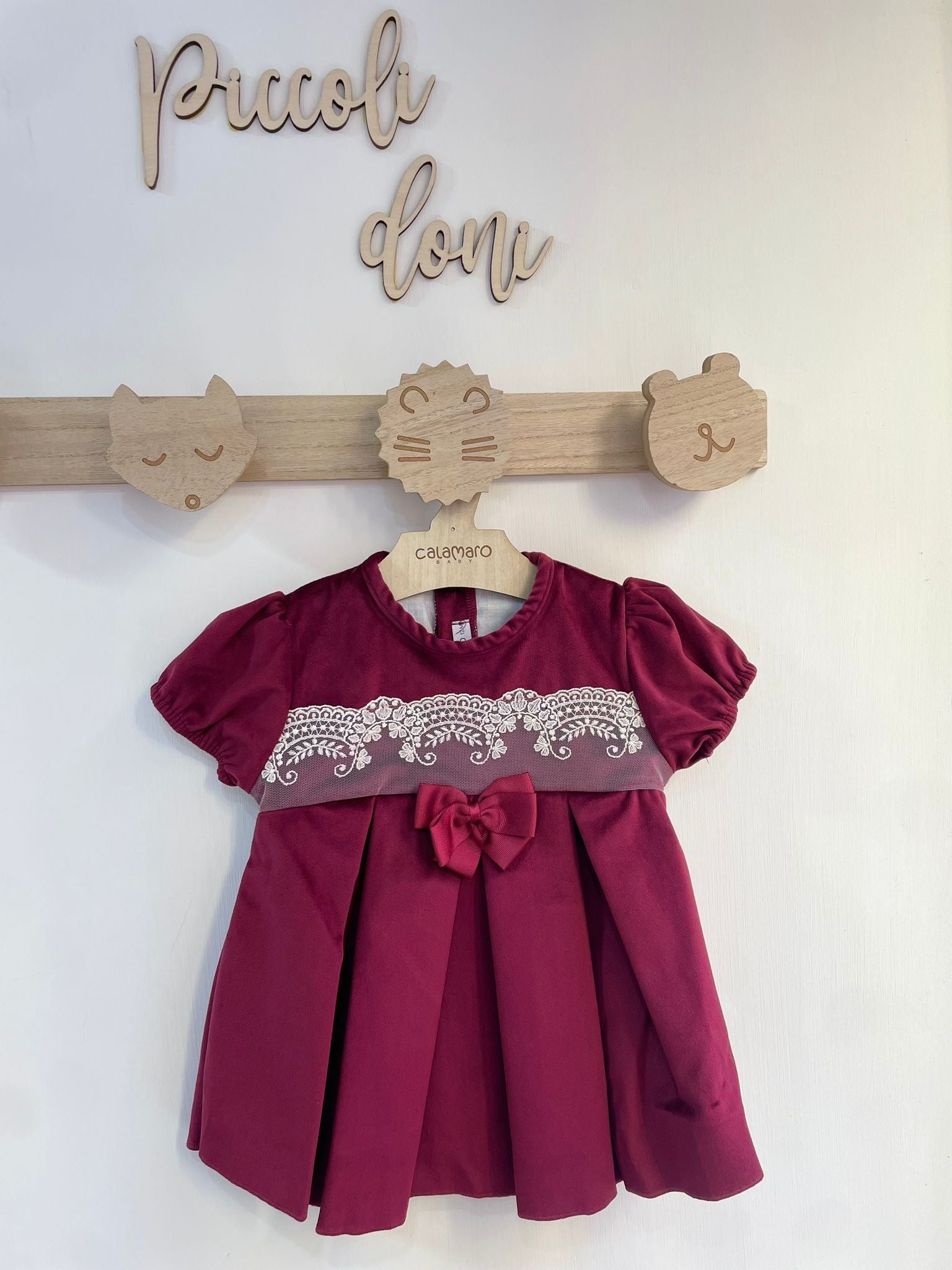 Elegante abito in velluto con spalline a palloncino e finiture in pizzo