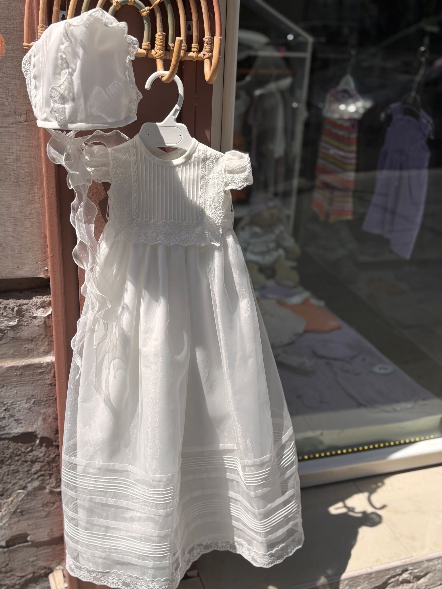 Abito lungo battesimale in organza e lavorato in pizzo con cuffia