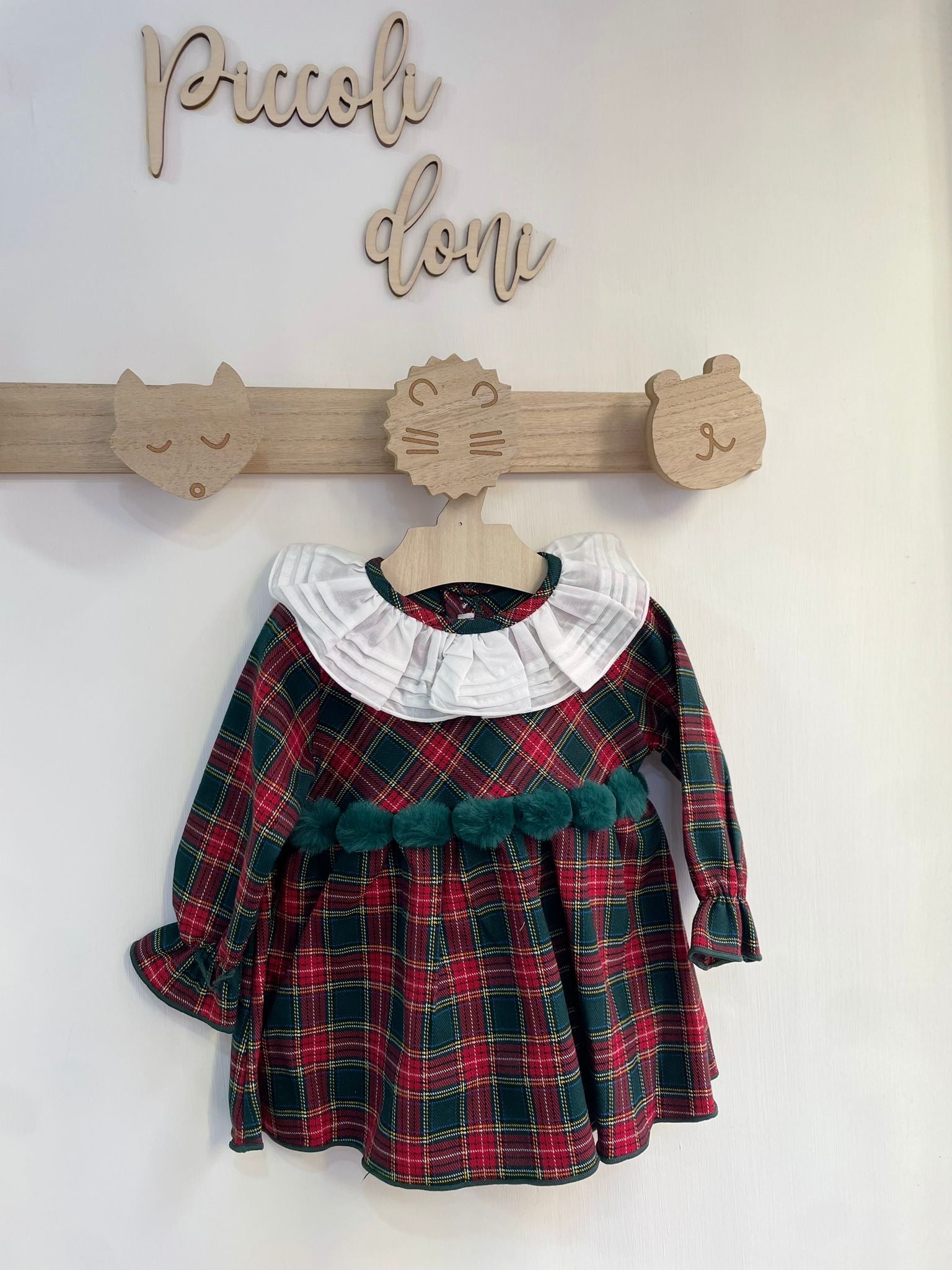 Abito scozzese in cotone invernale con pon pon in pelliccia