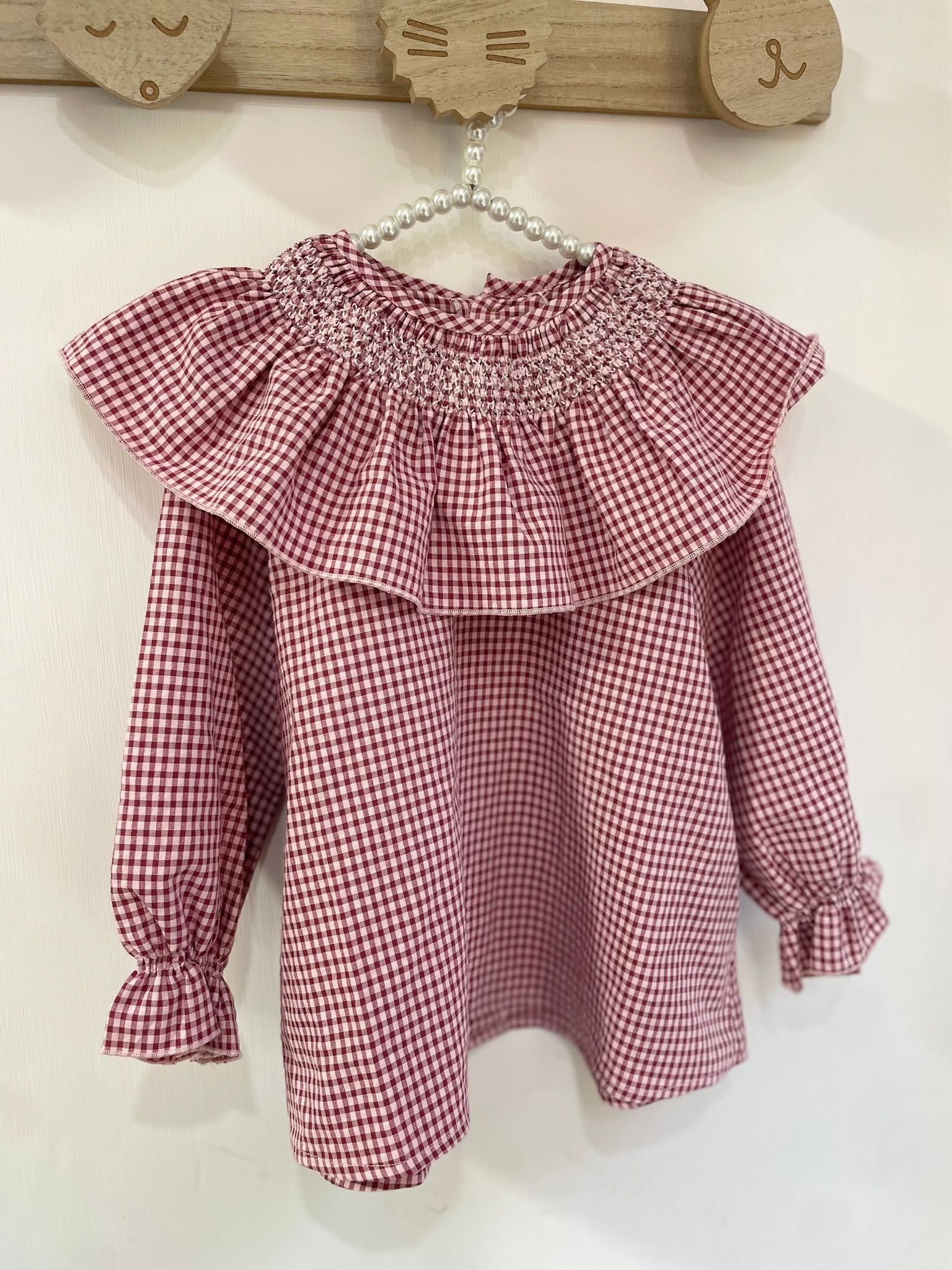 Camicia quadretti con collo largo in punto smock 100% cotone