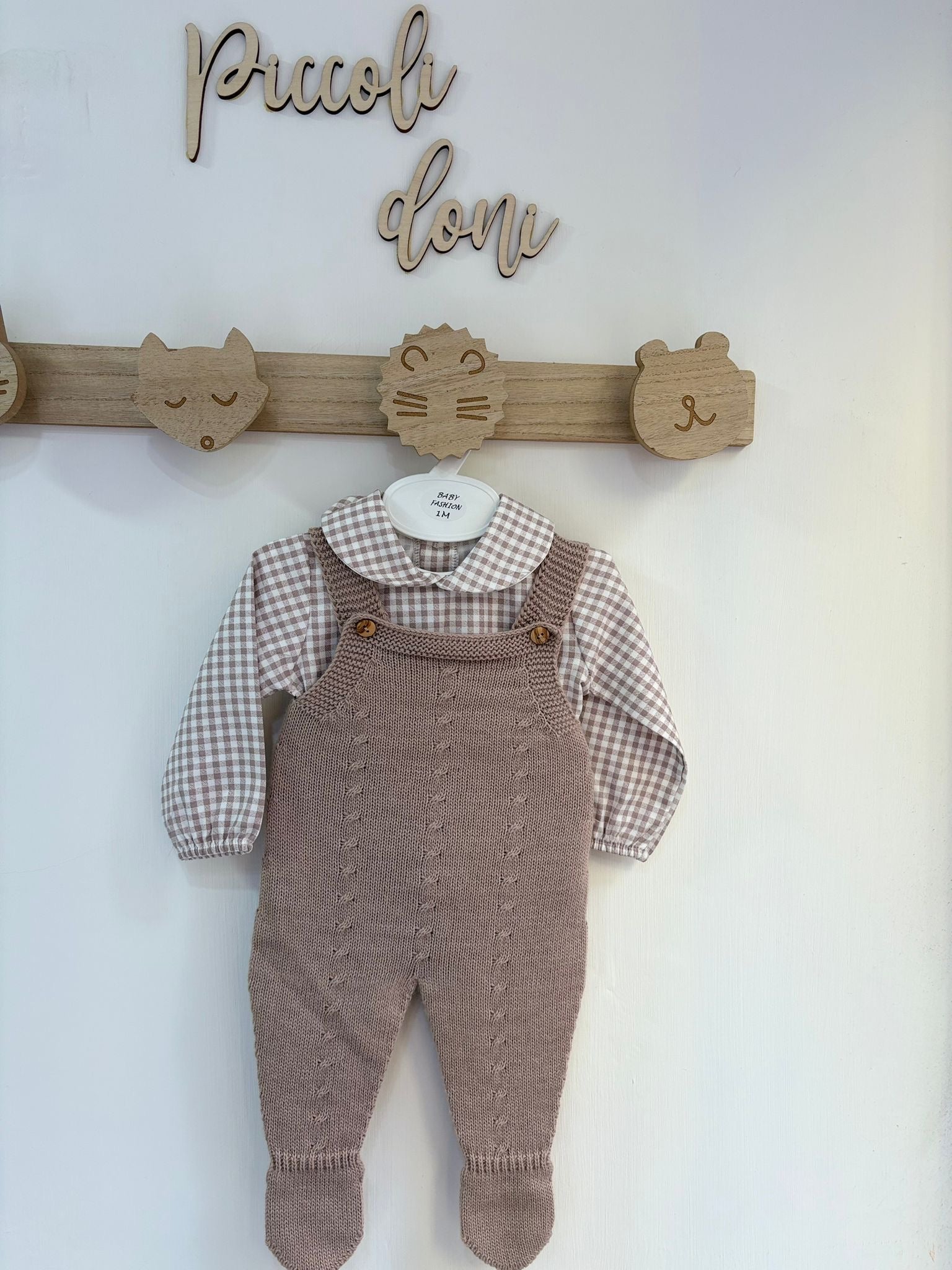 Camicia quadretti in cotone invernale con abbottonatura sul retro e salopette con piedini in acrilico invernale