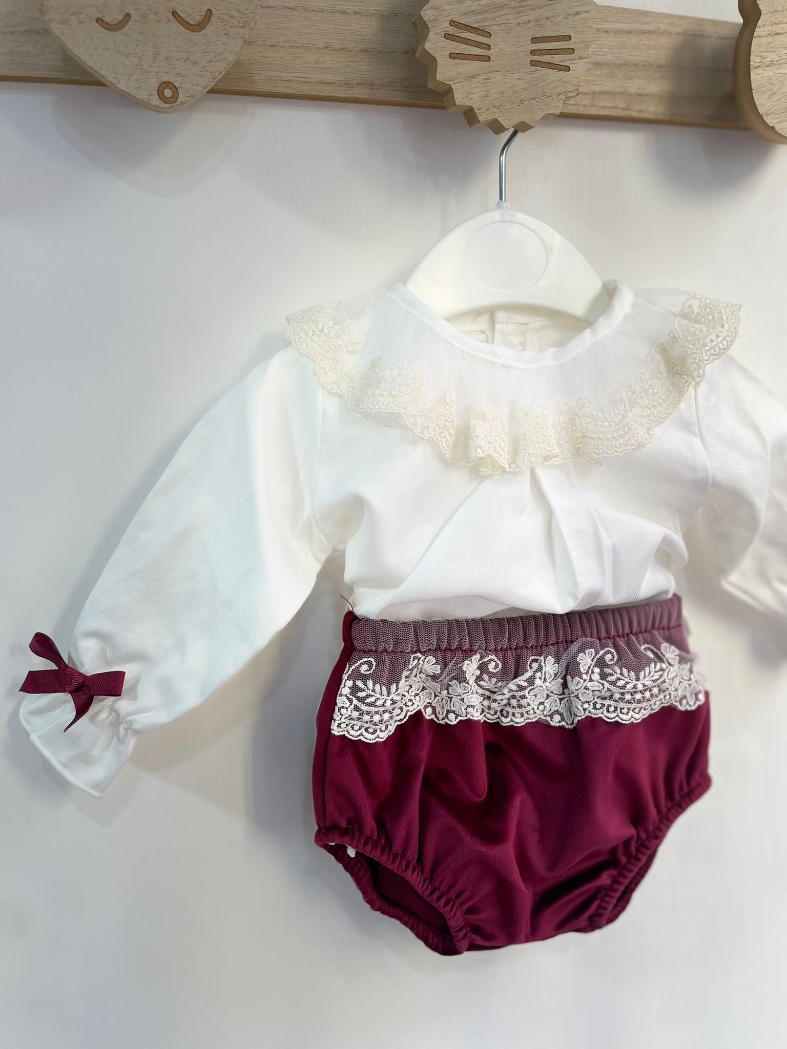 Camicia in cotone invernale con collo largo bordini in pizzo e fiocchi sui polsi e Culott in velluto