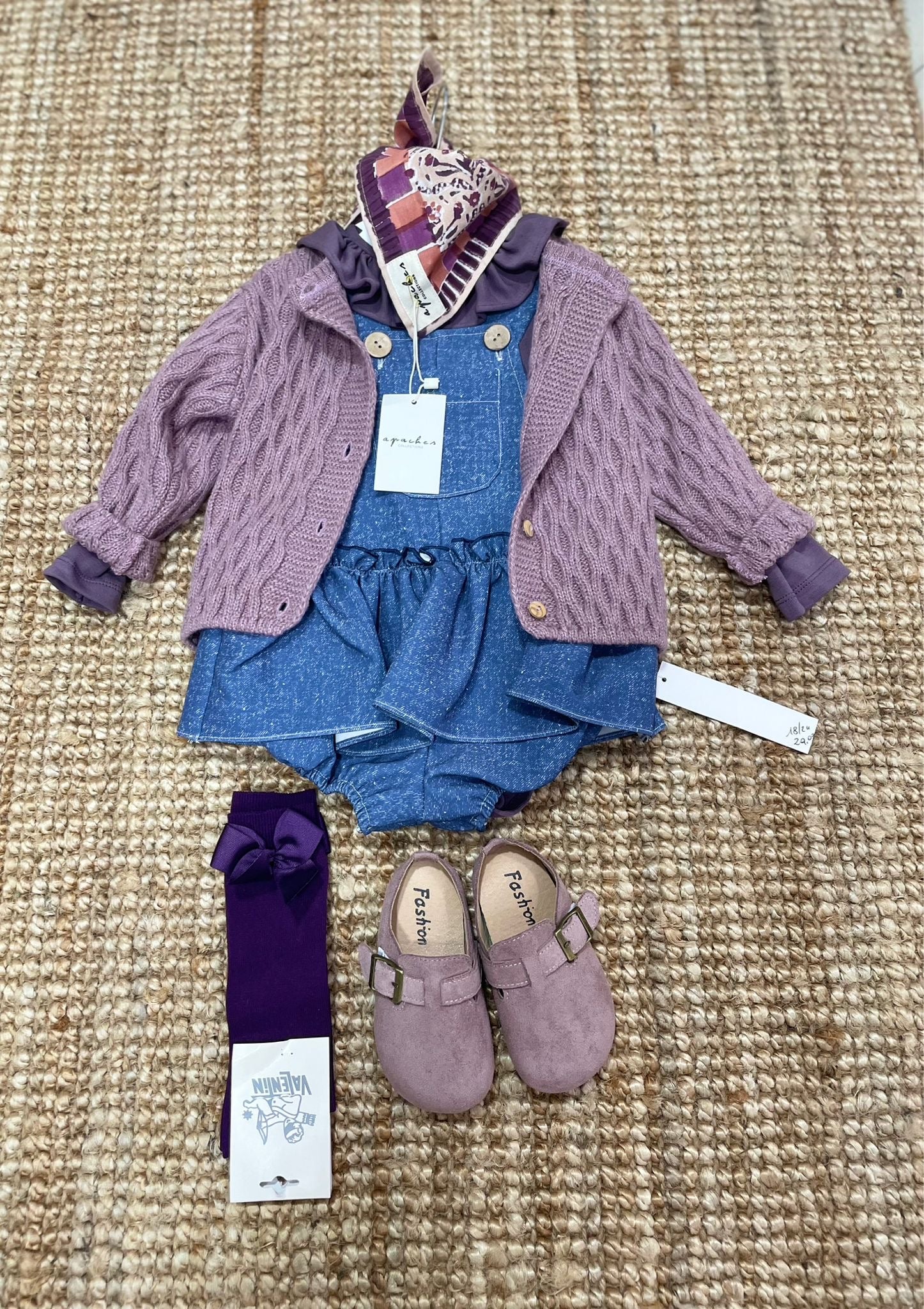 outfit composto da body in caldo cotone,salopette color jeans in cotone invernale,cardigan acrilico invernale,foulard e calzini