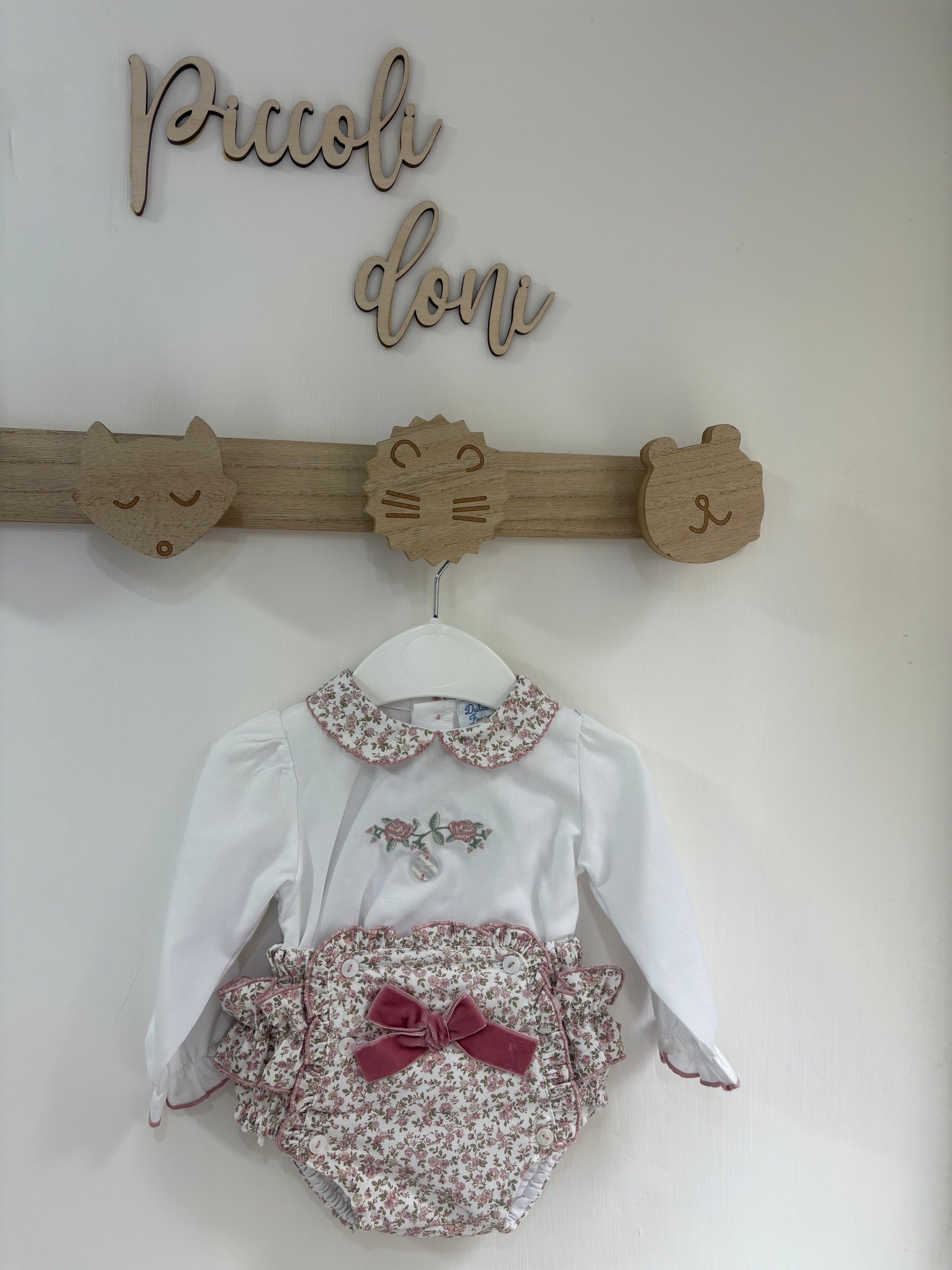 Camicia con rose ricamate e mutandina con fiocco in velluto in cotone invernale