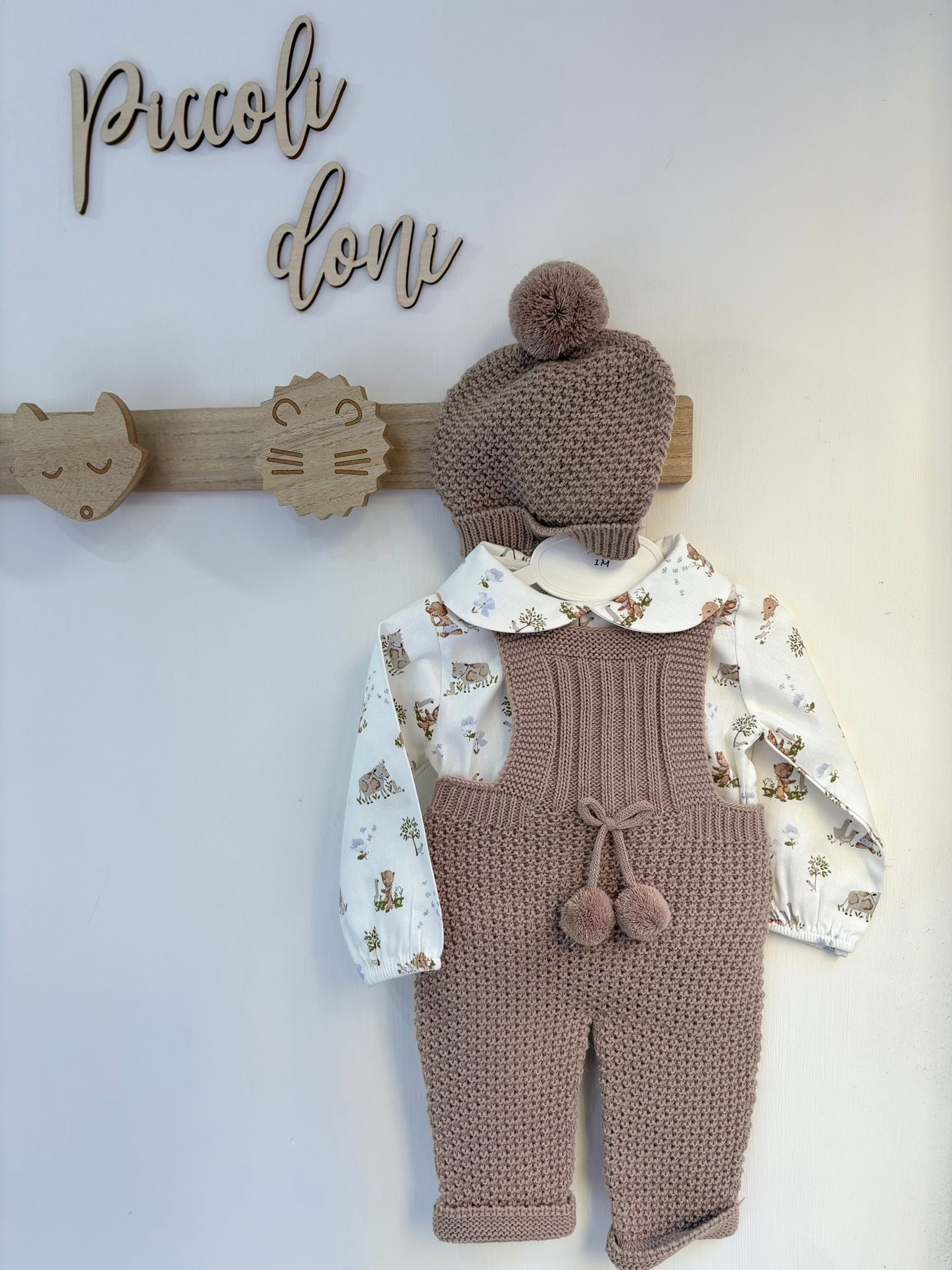 Salopette e cappello in acrilico con camicia in cotone invernale