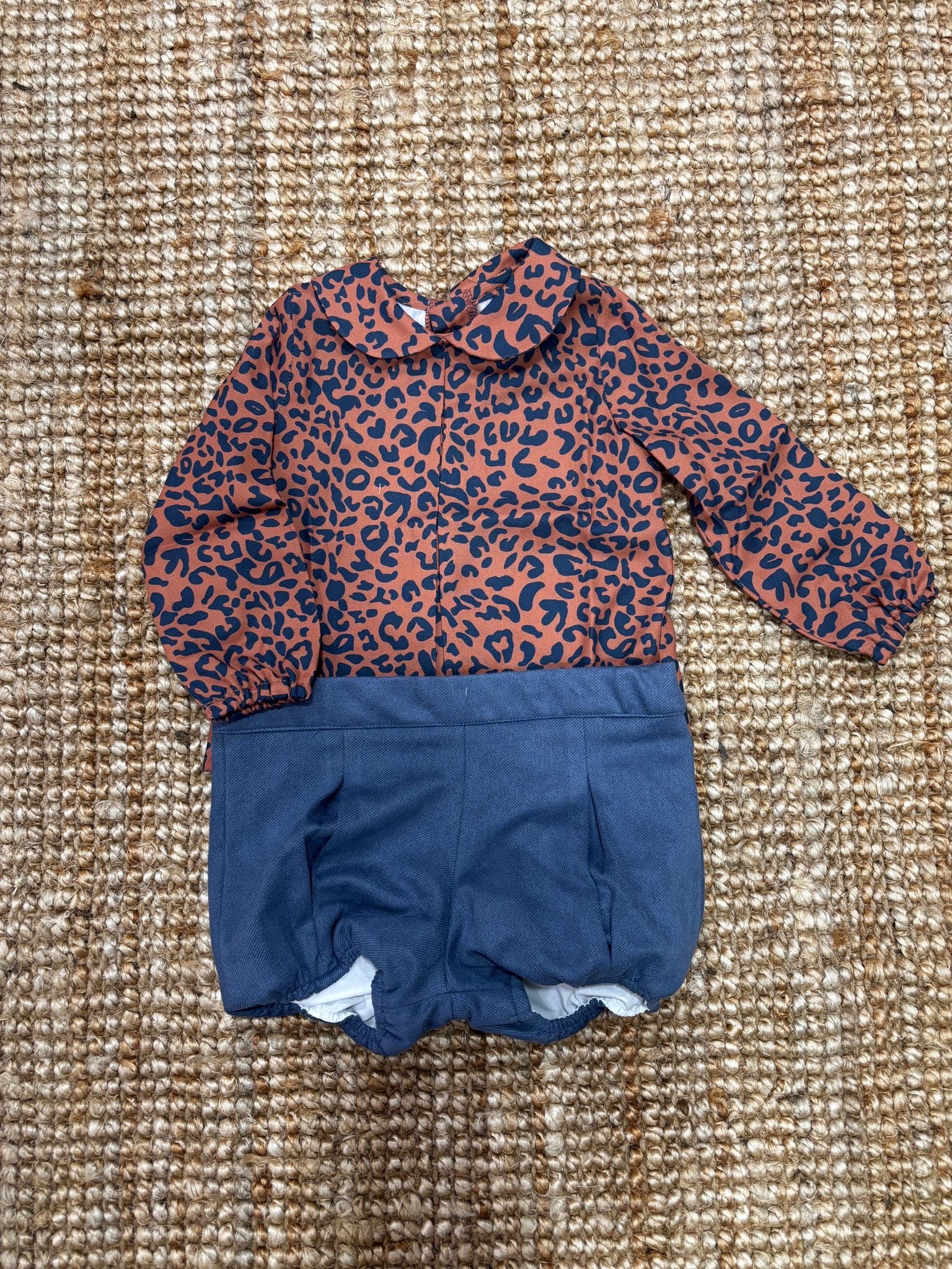 Camicina a maniche lunghe con fondo color ruggine e stampa leopardata nera. Presenta un colletto rotondo tono su tono, che dona un aspetto curato e dolce con culotte a palloncino in tessuto blu, con pieghe frontali e elastico alle cosce per una vestibilità comoda e un effetto leggermente bombato.