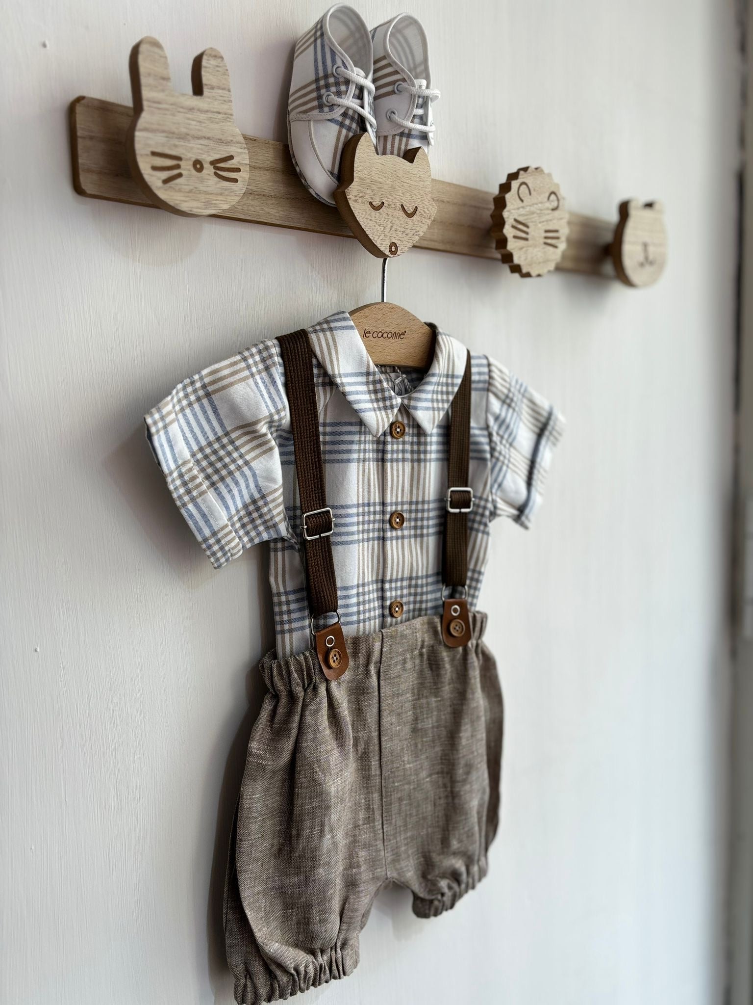 Camicia in lino e pantaloncino con bretelle rimovibili aggiunta di scarpine n17/18