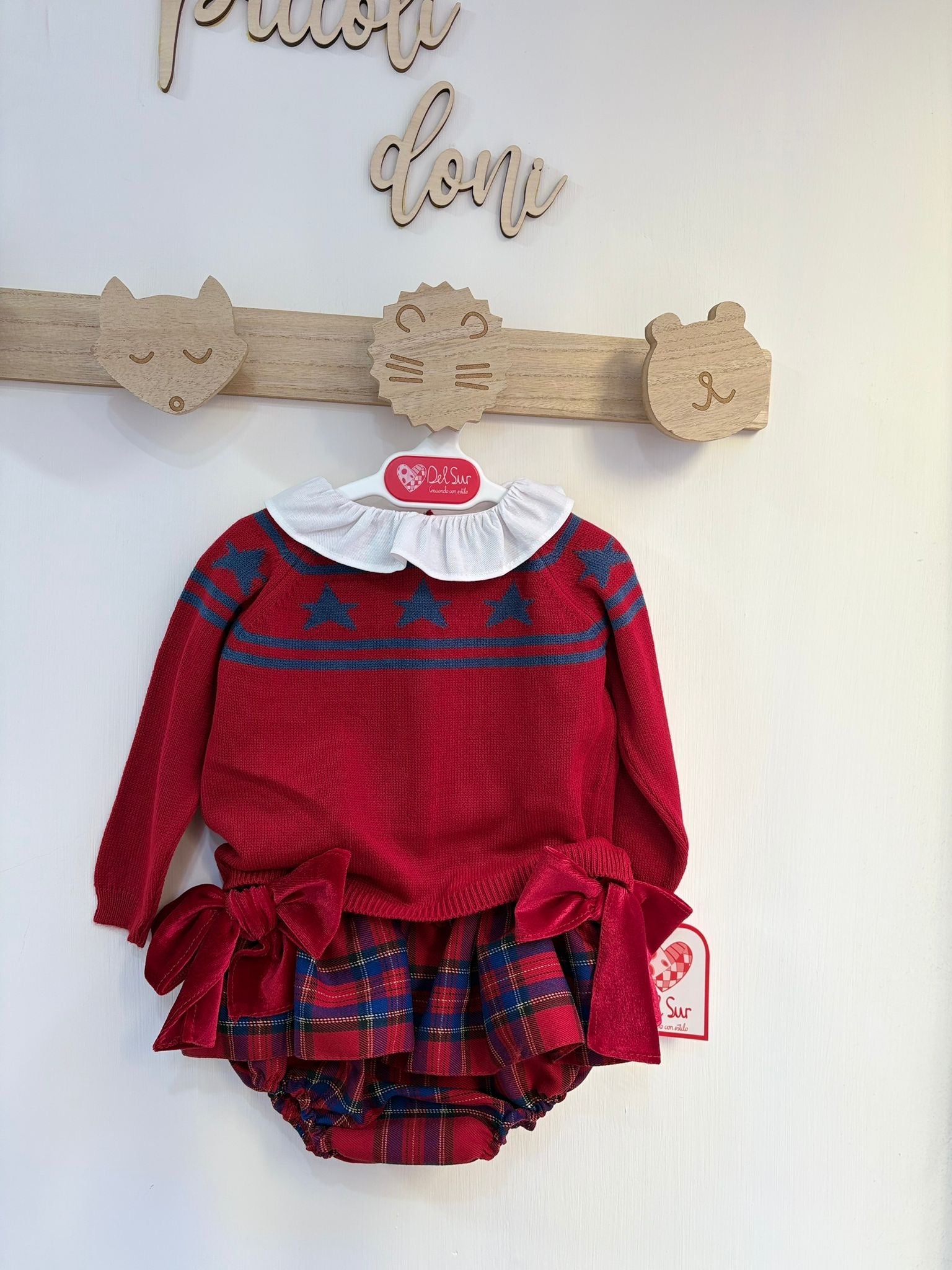 Culott scozzese con fiocchi in velluto lateralmente e maglioncino con collo finta camicia