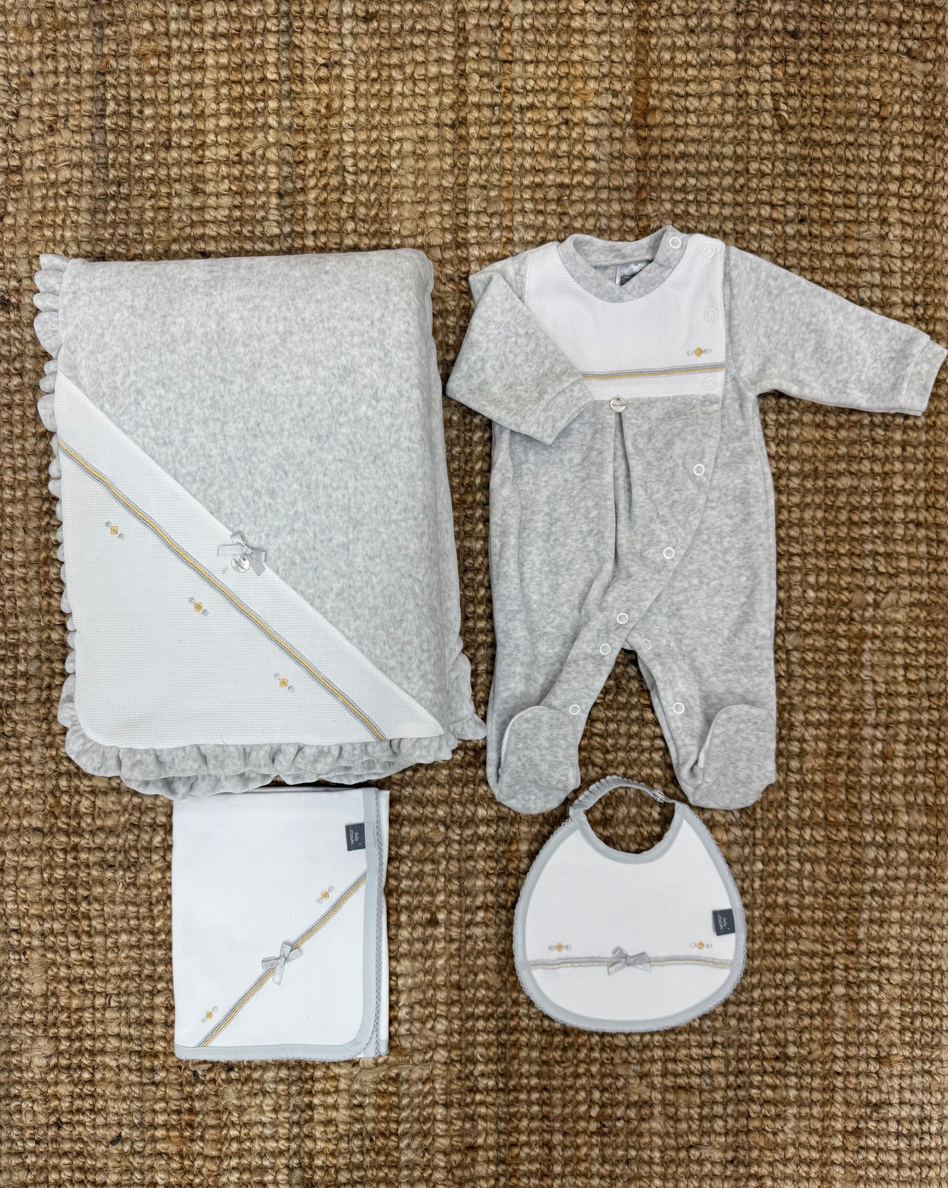 Set nascita composto da tutina e copertina in ciniglia con bavetta e quadrato 100% cotone