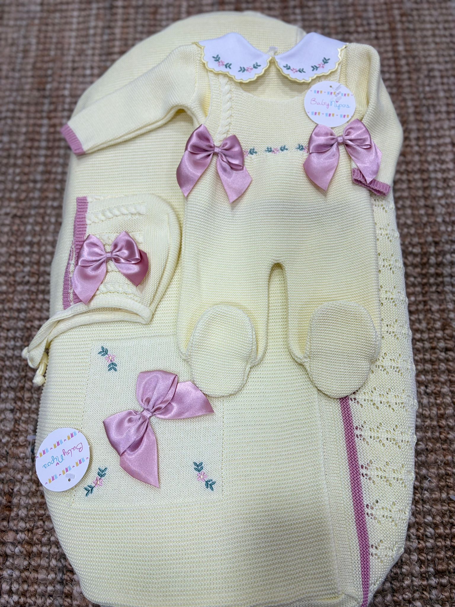Set nascita composto da salopette con magliettina,scialle e cuffia 100% filo di cotone