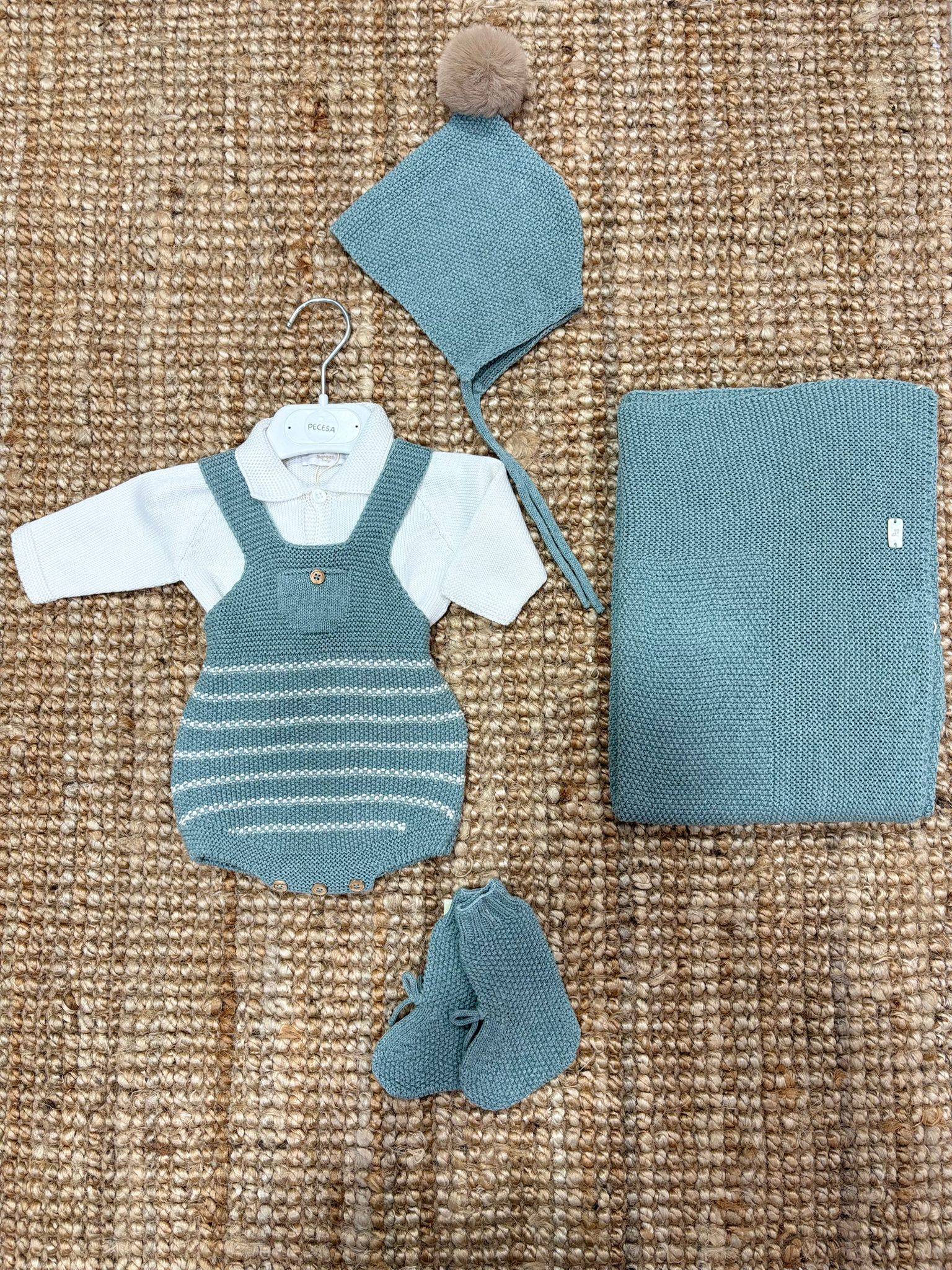 Set nascita composto da salopette,maglioncino a body,cappello,scarpine e copertina invernale