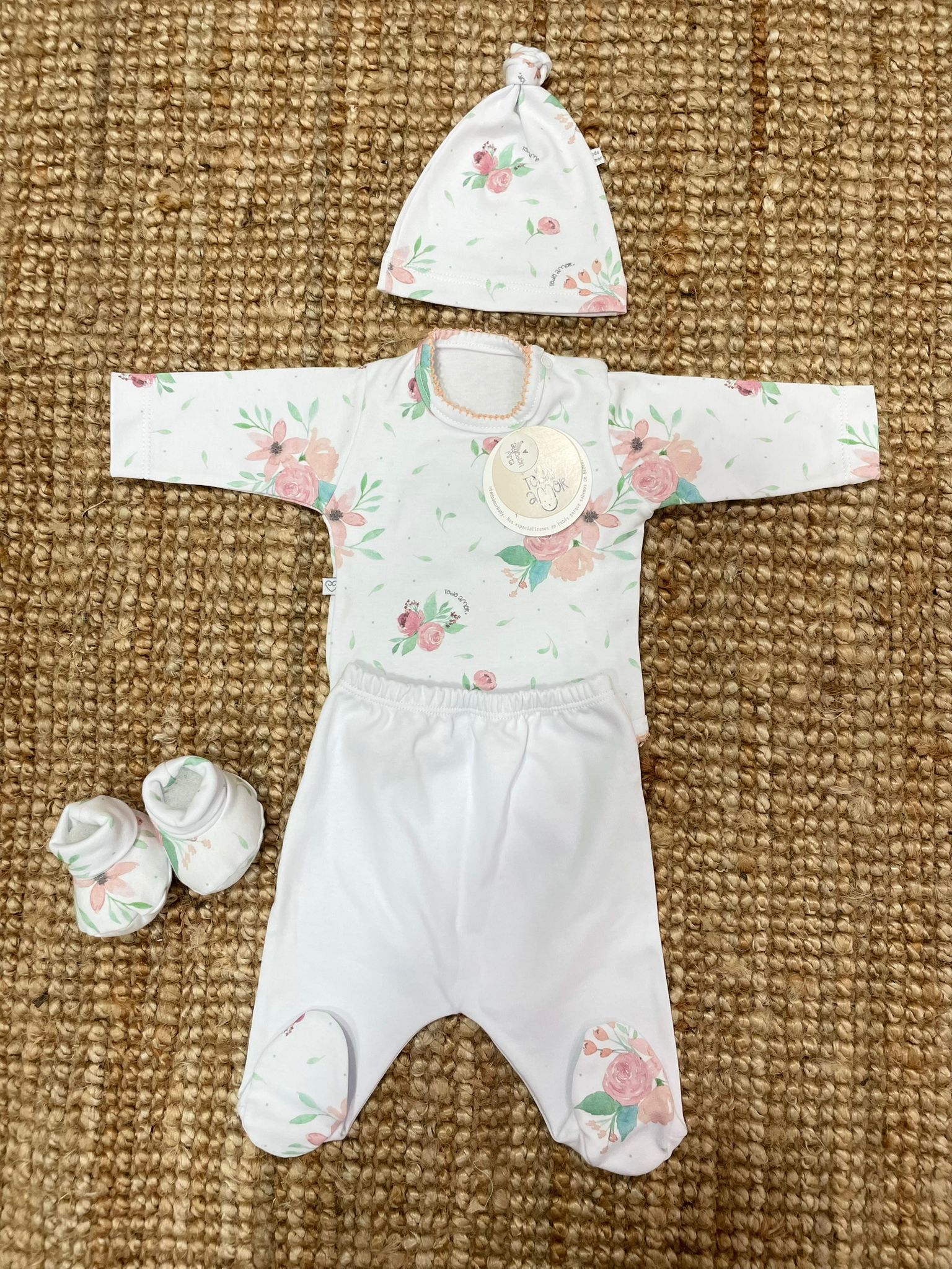 Set composto da body,ghettina,cappello e scarpine in cotone