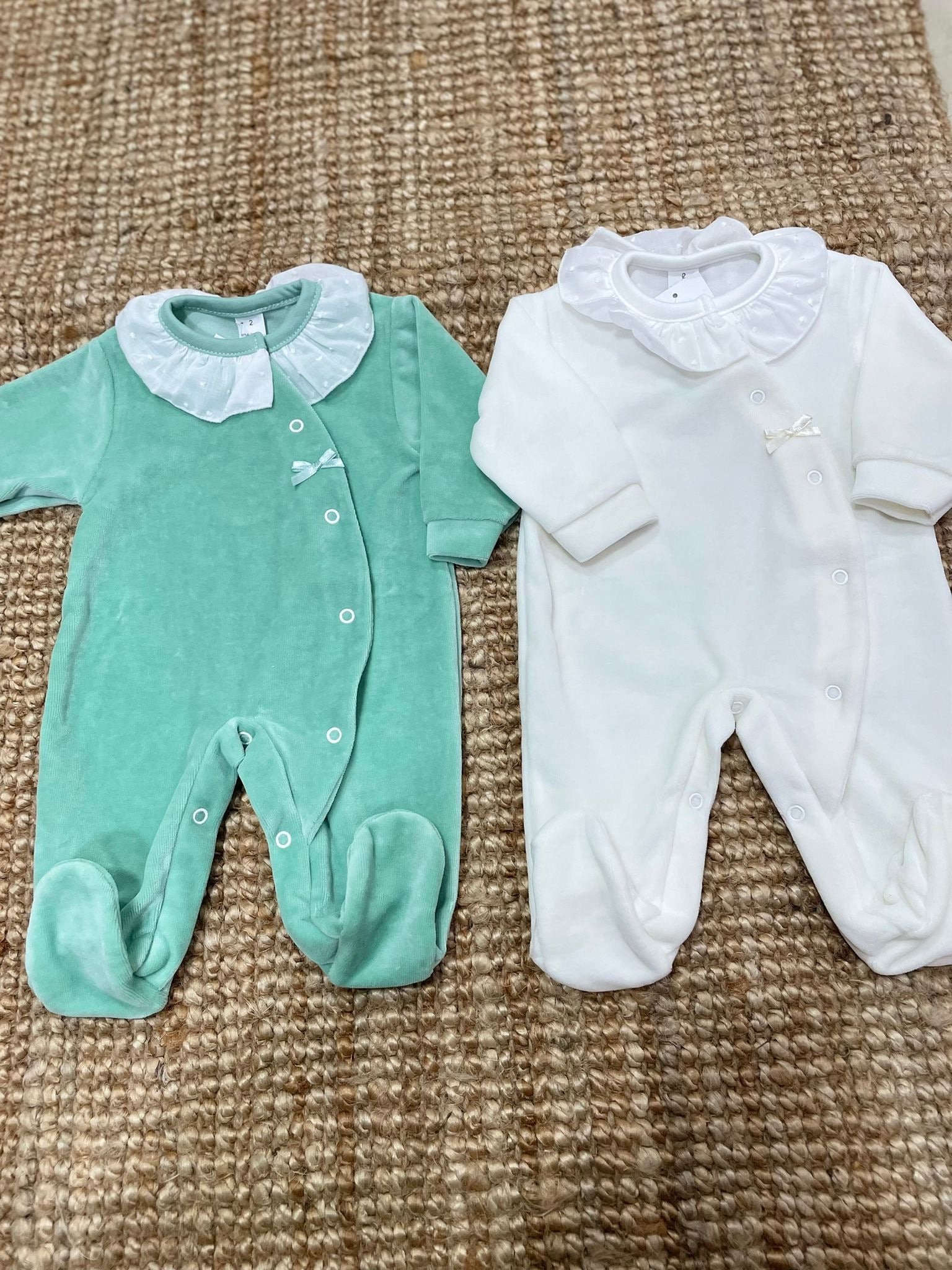 Tutina in ciniglia con abbottonatura sul lato e fiocco in raso